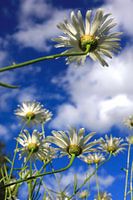 Bloeiende madeliefjes vanuit een kikkerperspectief in een tuin in de zomer