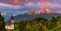 Zonsopkomst bij de beroemde Pelgrimskerk Maria Gern dichtbij Berchtesgaden in Zuid-Duitsland met blik richting de Watzmann-berg in Berchtesgaderner-land, Beieren, zuid Duitsland
