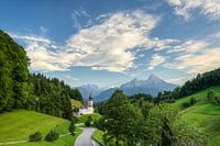 Panoramisch uitzicht op de bedevaartskerk Maria Gern in Berchtesgaden met de Watzmann op de achtergrond.