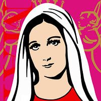 Een portret van Maria op een roze achtergrond met gouden engelen en in rood een deel van de tekst MAria.