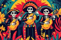 Mexicaanse mariachibands staan bekend om hun traditionele muziek, waarin verschillende regionale stijlen en instrumenten zijn verwerkt. Ze dragen typische kostuums geïnspireerd op de cowboys van de staat Jalisco en spelen liedjes over liefde, passie, religie en Mexicaans erfgoed. Mariachi-muziek werd in 2011 door UNESCO uitgeroepen tot immaterieel cultureel erfgoed van de mensheid. Het is populair bij veel festivals en gelegenheden, bijvoorbeeld op Dia de Los Muertos - de Dag van de Doden. Vier het leven met deze leuke poster van een Mexicaanse mariachi-muziekgroep.
