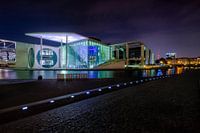 Een nachtelijk zicht op het Marie-Elisabeth-Lüders huis in Berlijn van over de rivier de Spree.