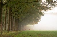 landschap op landgoed Mariendaal in Oosterbeek, Gelderland, met zicht op een mistige weide met koeien, en een bomenlaan