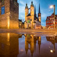 De Rode Toren en de Mariakerk in Halle-Saale weerspiegeld op een plas in de avond
