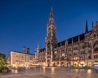 Blauw uur boven de verlaten Marienplatz in München. De torens van de Frauenkirche op de achtergrond.