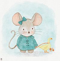 Marietje gaat op stap met haar gans. Ze heeft haar mooiste jas aangetrokken met bijpassende strik. Leuke illustratie voor de kinderkamer.