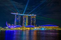 Deze foto van Marina Bay in Singapore is gemaakt op een avond in juni 2018. Op de foto zijn een aantal voorbeelden van de indrukkende architectuur in Singapore te zien. Dit zijn Marina Bay Sands en het ArtScience Museum.