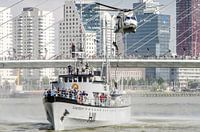 Een Marinier van het Korps Mariniers daalt tijdens de Wereldhavendagen in 2016 af vanuit een NH90 helikopter. Op de achtergrond is de Erasmusbrug en de skyline van Rotterdam te zien.