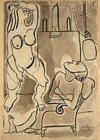 Werk zonder titel waarop in een huiselijke sfeer een echtpaar wordt weergegeven. De vrouw loopt naakt door de woning terwijl de man met de armen over elkaar in de zetel in het huis zit.