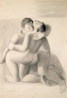 Titelloos zwart-wit werk waarbij één persoon de ander in de hals bijt. De voorste figuur is daarbij naakt waardoor de billen duidelijk vechten om aandacht