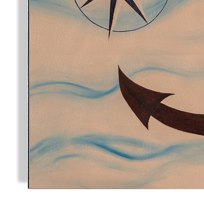 Dit schilderij is geschilderd met olieverf op canvas en vervolgens gedigitaliseerd. Het originele schilderij meet 1 x 1 meter. Een roestig anker, een stuurwiel en een nautische kompasroos. Op de achtergrond zijn abstracte golven te zien.