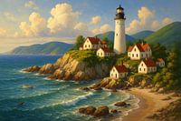 Een frisse bries ruist door het gras terwijl de golven zacht tegen de rotsen klotsen. Op een klif, omringd door witte huisjes met rode daken, staat de vuurtoren als een wachter van de tijd. Alles aan deze scène ademt rust: de ochtendzon op het water, de vissersboot die wiegt op de golven, de cottages die uitnodigen tot stil genieten. Dit is geen plek om te haasten, maar een plek om te zijn.