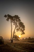 Foto van een prachtige markante boom op het Aekingerzand, ook wel de Kale Duinen genoemd, bij Appelscha. De foto is genomen op een mistige morgen. Gelukkig kwam de zon er toch nog even door. Dit duurde maar even en daarna trok het helemaal weer dicht.