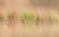 ICM, ofwel intentional camera movement. Je ziet de border van een waterplas met de reflectie in het water. Door de beweging van de camera maakt dit een abstract en kunstig beeld.