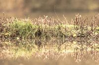 Closeup van een border bij een waterplas in Markelo, provincie Overijssel. De weerspiegeling is zichtbaar in het water en het licht speelt mooi op de takjes.