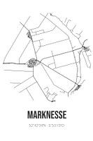 Zwart-witte landkaart, stratenplan of plattegrond van Marknesse. Marknesse is gelegen in de gemeente Noordoostpolder, provincie Flevoland. Op de stadskaart zijn alle openbare wegen in Marknesse opgenomen. Verder is de kaart voorzien van de coördinaten van het centrum van Marknesse.