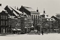 De markt van Maastricht voor het stadhuis op een winterse dag met sneeuwval