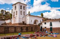 Markt in Chinchero, Peru. Marktplaats met witte huizen en kerk.