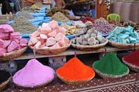 Straten van de Souks in Marrakesh, Marokko. Markt met tapijten. Smalle straten met scooters. Lokale bevolking verkopen traditionele producten op de markt.