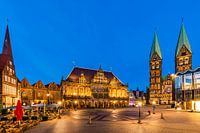Marktplein in Bremen met 's avonds het stadhuis, de Roland van Bremen, de St. Petri kathedraal en het parlementsgebouw.