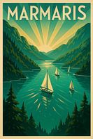 Vier de natuurlijke schoonheid van Marmaris met deze Art Deco reisposter, ontworpen in stralend groen en gouden tinten. Marmaris, genesteld tussen met dennenbomen bedekte bergen en kristalhelder water, is een van de meest geliefde vakantieoorden van Turkije. De poster toont een rustige baai waar witte zeilboten vredig glijden onder zonnestralen die over de weelderige heuvels breken. De kalme compositie weerspiegelt het tweeledige karakter van Marmaris als zowel een bruisend jachthavencentrum als een sereen toevluchtsoord. Met zijn geometrische stilering en warme palet weerspiegelt het kunstwerk de tijdloze elegantie van vintage reisposters, perfect om kustverfijning toe te voegen aan elke ruimte. Marmaris staat bekend om zijn turquoise baaien, bruisende nachtleven en zeilroutes langs de Turkse Rivièra en is zowel een droom voor avonturiers als een ontspanningsoord. Deze print is een uitstekende aanvulling voor kunstverzamelaars, reisliefhebbers of iedereen die geïnspireerd is door maritieme charme en natuurlijke landschappen. Hang hem in je huis of kantoor voor een vleugje reislust en mediterrane rust.