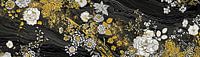 Marmer Flora | Botanisch Marmer - Dit gelaagde kunstwerk combineert de dynamiek van zwart marmer met de levendige zachtheid van botanische illustraties in goudgele en witte tinten. Het abstracte design krijgt een natuurlijke uitstraling door de florale motieven, en speelt met contrasten waardoor het zowel in een klassieke als een landelijke woonstijl past. Het is een tijdloze keuze die natuurlijke elegantie in de ruimte introduceert.