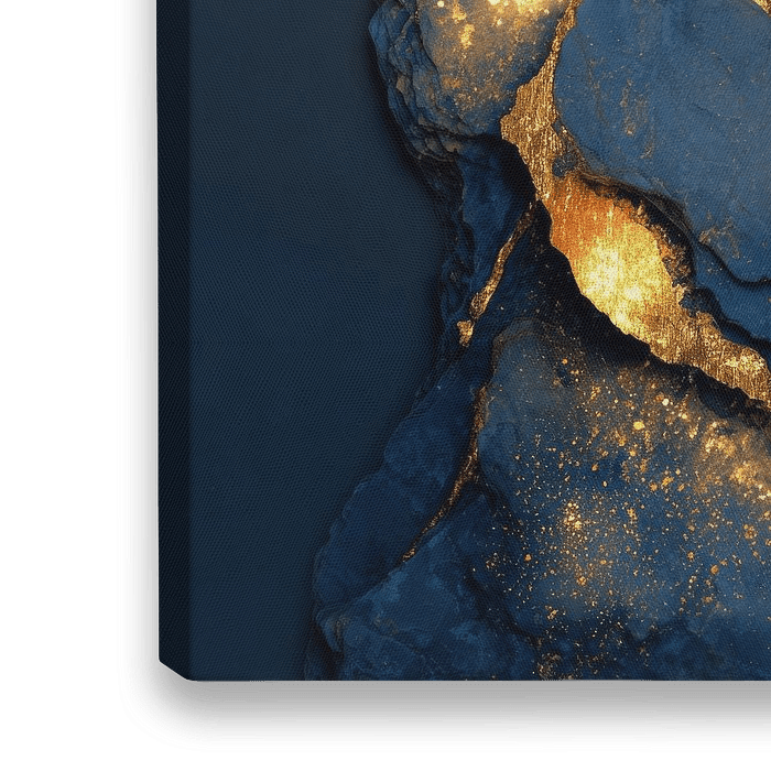 Deze luxueuze abstracte compositie toont een diepblauwe marmertextuur, doorkliefd door glinsterende gouden aders die zich als bliksemschichten een weg banen door het steen. De glans van het goud lijkt op gesmolten metaal en creëert een opvallend contrast met de matte, ruwe steenstructuur. Het spel van licht en textuur roept een gevoel…