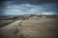 Marokkaans landschap met dorp .Ruig marokkaans landschap met dreigende wolken. Atlas gebergte. Klein dorp in Marokko