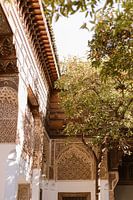 Tropisch groen en Marokkaanse architectuur komen samen in dit beeld dat gemaakt is in het prachtige Bahia paleis in Marrakech, Marokko. Muren vol details, voor mij ware kunst! Daarnaast de sinaasappelbomen die er een vrolijke sfeer aan geven.
