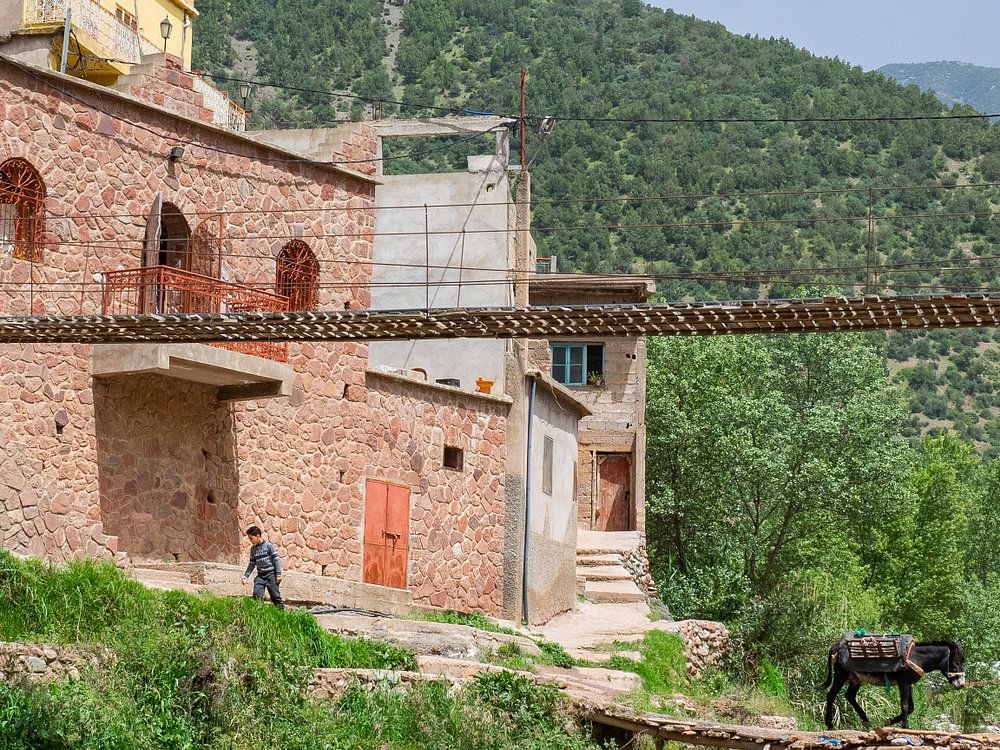 In een mooi bergdorpje buiten Marrakesh in Marokko steekt een Marokkaanse vrouw met ezel de rivier over