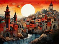 Een geschilderd tafereel van Marokko onthult zich als een levendige schets op het doek. De kleuren van het woestijnlandschap dansen samen in warme tinten - goudgeel en terracotta. De sfeer ademt de mystiek van de medina's, waar smalle straatjes kronkelen tussen marktkramen. Vogels steken af tegen de lucht, en de contouren van de gebouwen vormen een majestueus decor. De kunstenaar vangt de essentie van Marokko in lijnen en vegen, waardoor de kijker wordt meegevoerd naar de betoverende straten van dit Noord-Afrikaanse land.