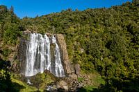 Marokopa waterval in Nieuw Zeeland. Midden in een groen omgeven bergwand met een strakke blauwe lucht op de achtergrond.