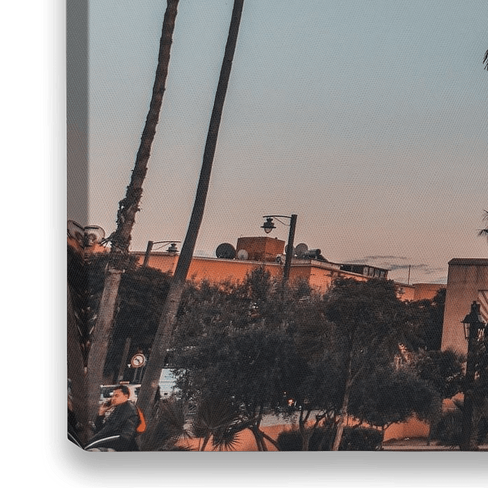 De palmbomen in het centrum van Marrakesh, Marokko onder het maanlicht. 's Avonds is het net zo druk op straat als overdag in deze levendige stad.