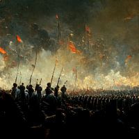 "March through Hell" toont een krachtige en dramatische oorlogsscène waarin een enorme formatie soldaten met opgeheven vlaggen oprukt door een met rook gevuld slagveld. Vurige oranje vlammen verlichten de chaos en vormen een schril contrast met de donkere, stormachtige lucht. Het beeld straalt zowel grootsheid als intensiteit uit en…