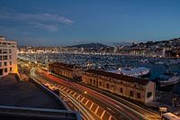 De Oude Haven en de Avenue Major: een prachtig lichtspel bij valavond. De lichtstrepen onderaan diagonaal in beeld zijn strepen van voorbijrijdende auto's.