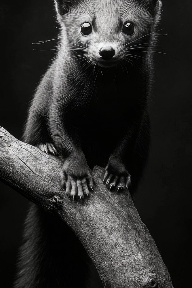 Een majestueus dier in elegant zwart-wit verkent zijn omgeving vanaf een boomstam met een doordringende blik. Het straalt een mysterieuze gratie uit en trekt ieders aandacht. Deze foto zou prachtig staan in een woonkamer en een rustige maar betoverende sfeer creëren.