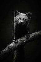 In een fascinerend spel van licht en schaduw wordt een nieuwsgierige kleine marter gepresenteerd op een elegante tak. De intense zwart-witafbeelding benadrukt zijn expressieve gezicht en soepele poten, brengt een vleugje wild in de woonkamer en creëert een charmante en levendige sfeer.