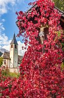Marterl en rode wijn bij de kerk van St. Veit in de Pragsvallei, Zuid-Tirol, Italië