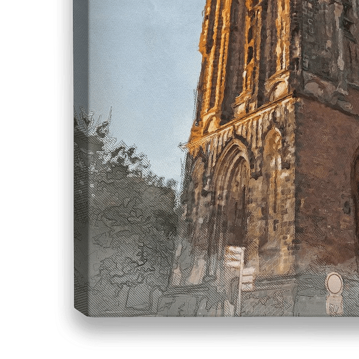 Deze uitvoering in een mixed media van foto. waterverf en pentekening is uniek. Vooral het laatste zonlicht doet toren in gouden gloed te zetten