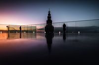 Twee jonge mensen gescheiden door de Martinitoren op het dakterras van Forum Groningen. De silhouetten, het licht en de reflecties zetten de verbeelding aan het denken.