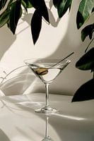 Een vleugje elegantie en ontspanning ontvouwt zich in deze stijlvolle compositie. De glinsterende martini, met daarop een olijf, trekt onmiddellijk de aandacht, terwijl de zachte schaduwen van de bladeren een rustgevende sfeer creëren. Dit kunstwerk is perfect voor de woonkamer en nodigt uit tot een moment van bezinning of gezelligheid.
