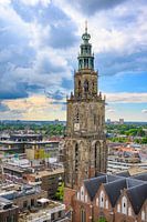 Uitzicht over de Martinitoren (d' Olle Grieze) in de stad Groningen in Nederland vanaf het Forum cultureel centrum met een dramatische lucht erboven.