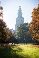 Het Martinikerkhof in het centrum van de stad Groningen tijdens de Herfst. Op de achtergrond de Martinitoren en een deel van de Martinikerk.