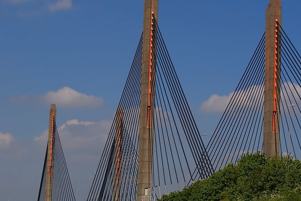 De Martinus Nijhoffbrug is een kabel- of tuibrug over de rivier de Waal nabij Zaltbommel in de snelweg de A2 op Rkm 933,6. De brug werd op 18 januari 1996 geopend door minister Jorritsma van Verkeer en Waterstaat. De brug is gefotografeerd op een mooie voorjaarsdag met een blauwe lucht die getekend is met een paar wolken.