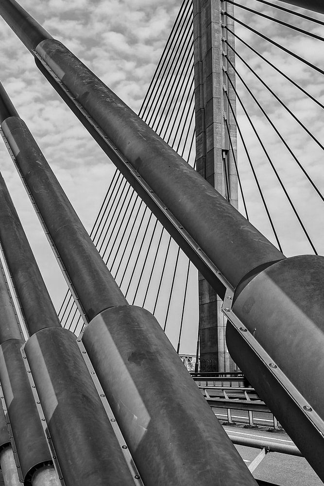 De dikke kabels van de Martinus Nijhofbrug in de autoweg A2 nabij Zaltbommel en Waardenburg in Gelderland. Deze kabelbrug of tuibrug over de Waal is vernoemd naar de dichter en schrijver Martinus Nijhoff. De fraaie architectuur van de brug is afkomstig van Combinatie BVW: BVN (later Oranjewoud), Veth (later IV Consult), de Weger (later Royal Haskoning). Een fraaie schaapjeswolkenlucht maken deze foto extra bijzonder.