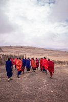 Masai met authentieke kledij en outfit op de droge vlaktes van Tanzania tijdens een bewolkte ochtend. Kledij in mooie blauwe, rode en oranje kleuren.