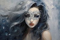 Masker van Mystiek | Modern Portret - Hier zien we een intrigerend hedendaags portret van een vrouw, wiens blik gevangen zit achter een sierlijk Venetiaans masker, geschilderd met een mix van realisme en abstracte flarden. De dynamiek van zwierig blauwgrijs haar werkt bijna hypnotiserend en contrasteert met haar bleke, verfijnd…