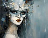 Maskerade | Blauwgrijs - Dit portret trekt direct de aandacht met een intrigerend Venetiaans masker dat bedekt is met parels en glinsteringen, waardoor er een gevoel van mysterie en elegantie uitstraalt. De koele blauwgrijze en witte tinten zorgen voor een zachte achtergrond, terwijl de rijke textuur en losse penseelstreken een modern gevoel geven. Maskers doen denken aan thema's rond verborgen emoties en identiteit, en dit kunststuk speelt daarmee door het onbekende achter de façade te suggereren.