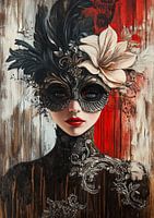 Maskerade | Gemaskerde Schoonheid - Dit vrouwenportret schilderij toont een mysterieuze vrouw met een weelderig versierd masker en een opvallend rood-zwarte achtergrond.