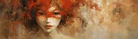 Maskerade | Oranje - Dit evocatieve portret vangt de kijker met zijn ruwe, expressieve penseelstreken en het intrigerende gebruik van maskers, die zowel letterlijk als figuurlijk een laag van mysterie toevoegen. Het kleurenpalet is warm, met bruintinten en accenten van oranje en wit, die samen een gevoel van diepte en emotie uitstralen.